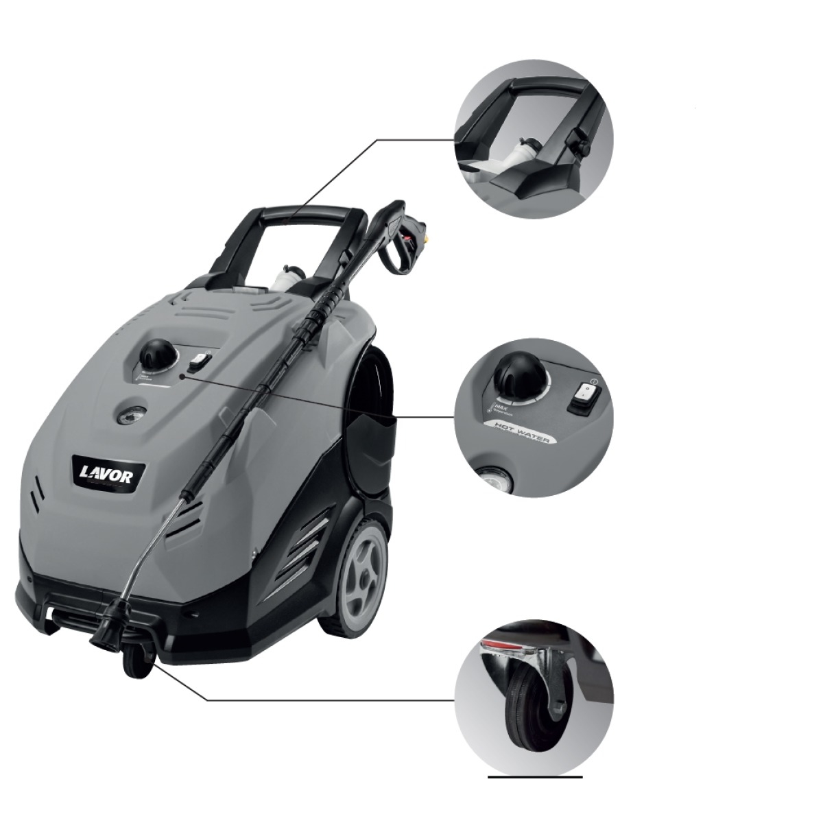 Der HDR AUCKLAND 1310 ist ein robuster Heißwasser-Hochdruckreiniger aus dem Hause LAVOR, er findet seinen Aufgabenbereich überwiegend in der Industrie, vor allem dort, wo es zu hartnäckigen Verschmutzungen kommt, wie industrielle Fertigungsstraßen, Handwerksbetriebe, Werkstätten usw. Ein Heißwasser-Hochdruckreiniger ist gegenüber einem Kaltwasser-Hochdruckreiniger, gerade bei jeder Art von Schmierstoffen klar im Vorteil und wird diesen daher gerne vorgezogen.
